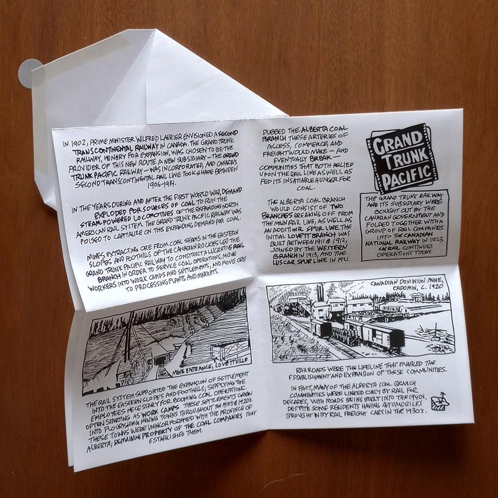 Physical zine "Ghost Towns of the Alberta Coal Branch" (11x17, folded down to 1/4 page / 5.5 x 4.25"), packaged in a printed envelope with removable label enclosure. Shipped in separate envelope for protection while in transit.